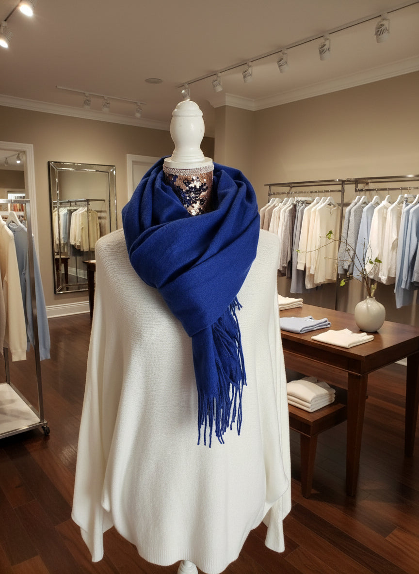Elevate your winter wardrobe with this luxuriously soft fringed scarf in rich royal blue. Crafted from premium polyester, it drapes beautifully and offers exceptional warmth without bulk. The elegant fringe detailing adds refined texture, while its versatile length allows for multiple styling options—wear it draped, wrapped, or tied for effortless sophistication. Machine washable for convenient care, this timeless piece transitions seamlessly from casual to formal occasions, making it an essential accessory for the discerning wardrobe.