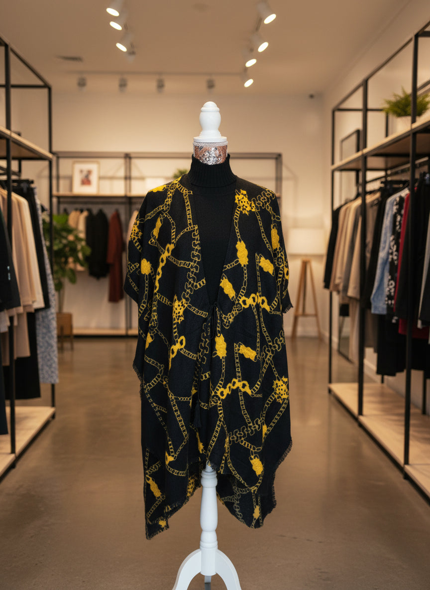 Effortlessly elevate your everyday wardrobe with this versatile Black and mustard over cover. Layer it over your coat or jumper for an instant boost of warmth and refined style. The beauty of this piece lies in its adaptability—drape, tie, or style it in multiple ways to suit your mood and occasion. A sophisticated accessory that transforms any outfit with understated elegance and practical comfort.
