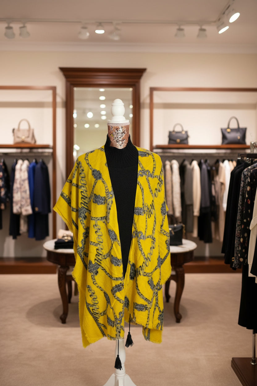 Effortlessly elevate your everyday wardrobe with this versatile Mustard grey and black over cover. Layer it over your coat or jumper for an instant boost of warmth and refined style. The beauty of this piece lies in its adaptability—drape, tie, or style it in multiple ways to suit your mood and occasion. A sophisticated accessory that transforms any outfit with understated elegance and practical comfort.