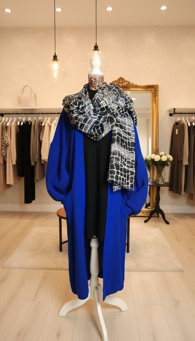 Elevate your everyday wardrobe with this striking royal blue cardigan, crafted from sumptuous chunky knit fabric that delivers both warmth and texture. The generous length provides sophisticated coverage, while practical front pockets add functional style. Perfect for layering over dresses or pairing with tailored trousers, this versatile piece transitions seamlessly from casual weekends to polished office settings. The substantial knit construction ensures lasting durability and maintains its shape season after season. Fits one size 10/18 we teamed it up with our lovely scarf and black turtle neck jumper sold separately.