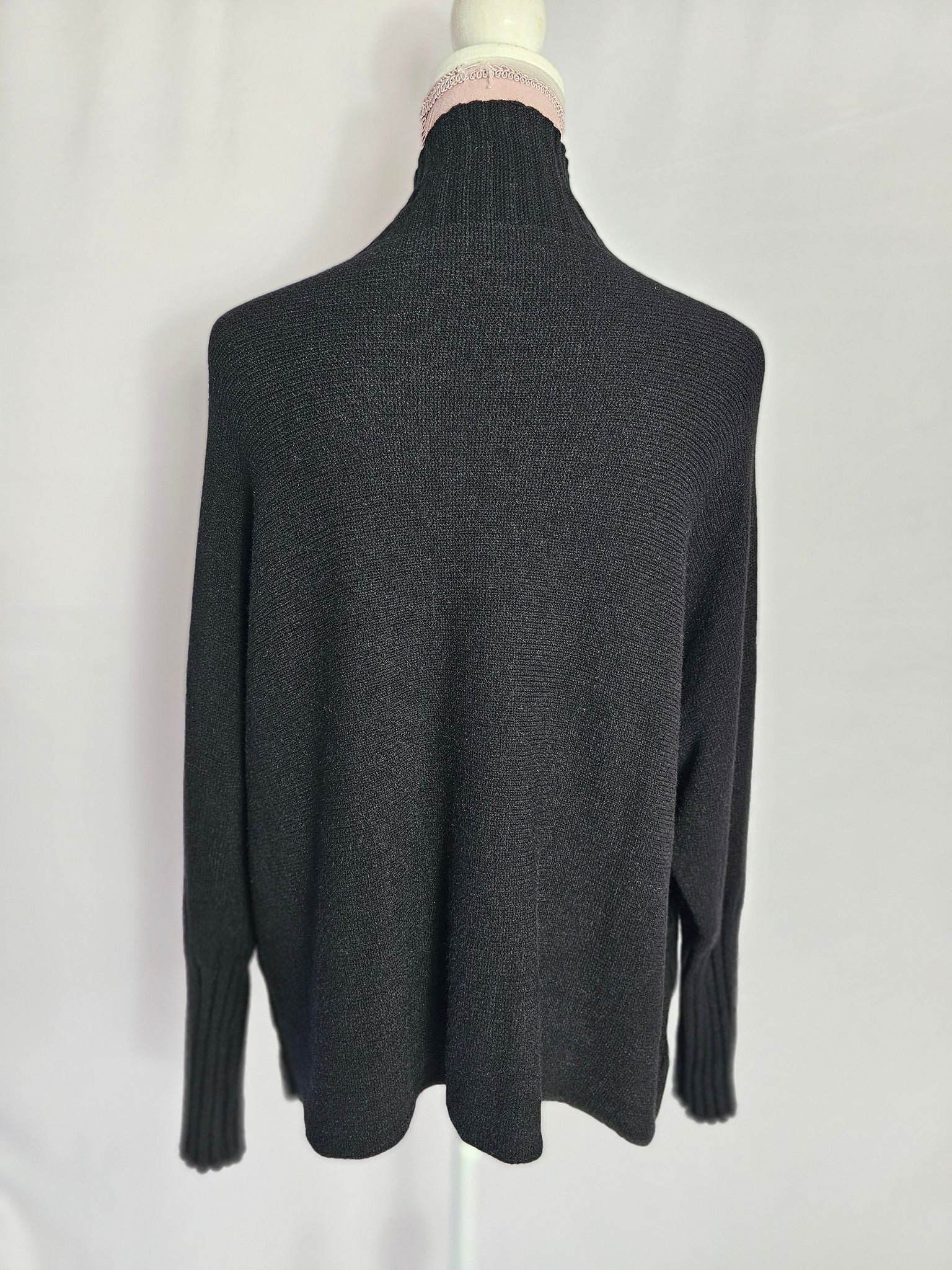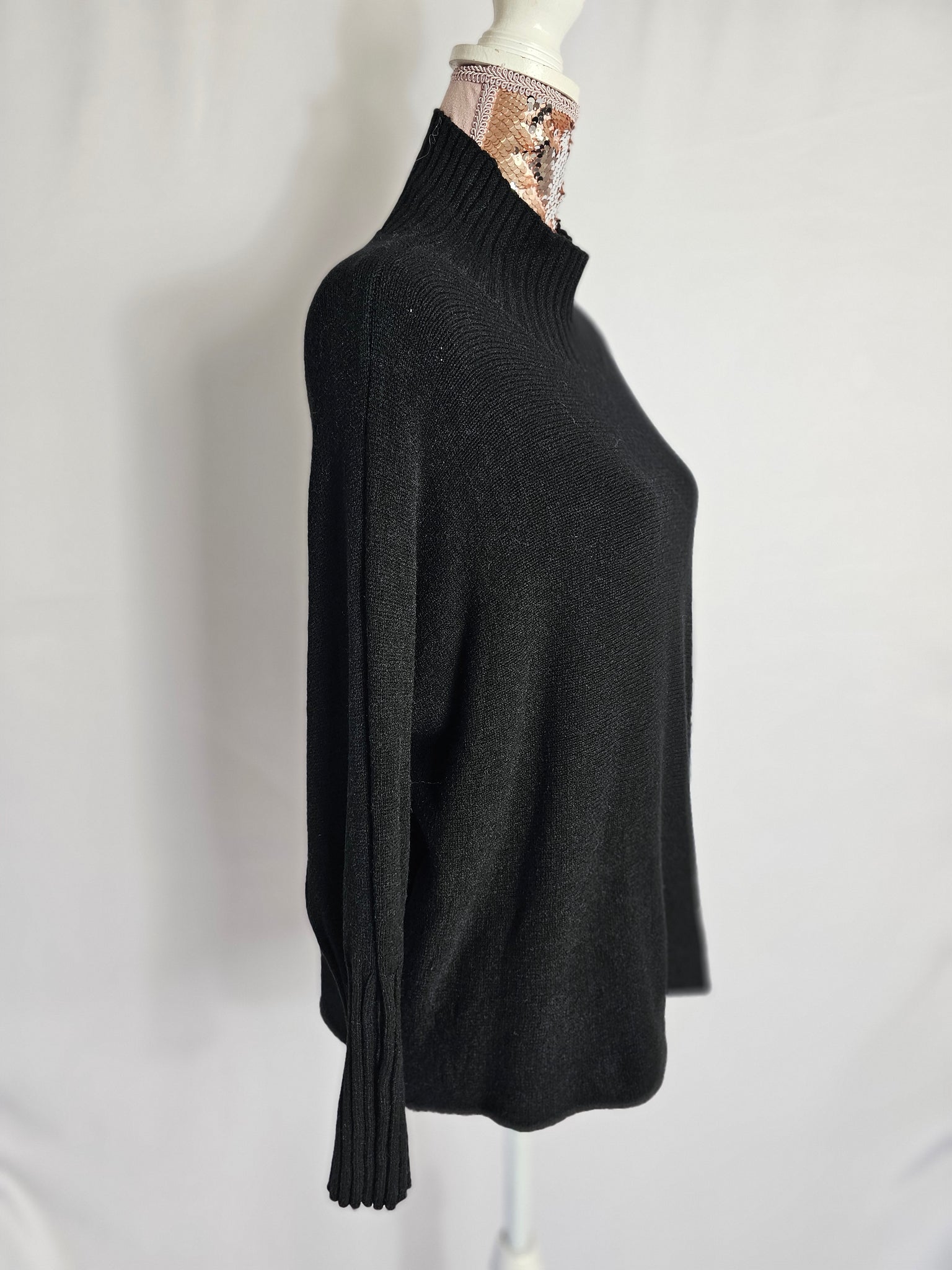 Elevate your wardrobe with this Italian black high neck jumper, crafted from sumptuous soft fabric that drapes beautifully. The versatile design transitions effortlessly from casual to refined—layer it under tailored blazers or style with our curated collection of costume necklaces and scarves for added sophistication. Designed to fit sizes 12-20, this timeless piece demands gentle hand washing to preserve its luxurious quality. A refined essential for the discerning wardrobe.